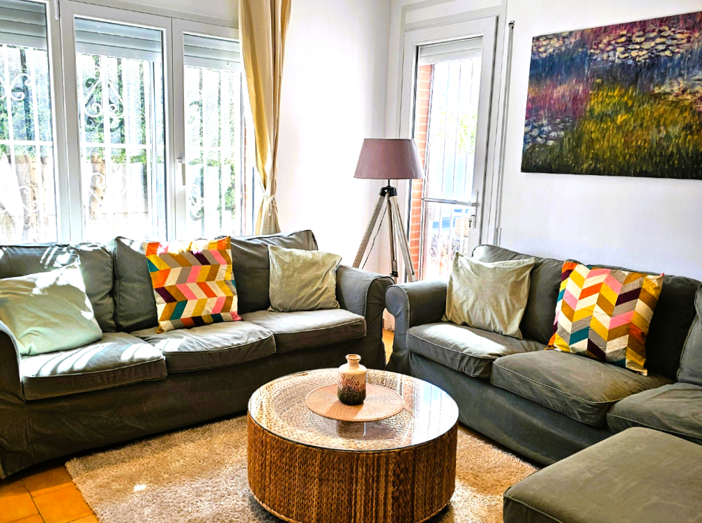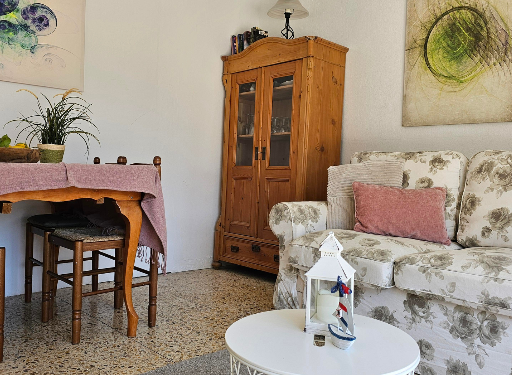 - Gemütliches Wohnzimmer mit SAT-TV und Couchgarnitur, Fenster mit Fliegengitter.