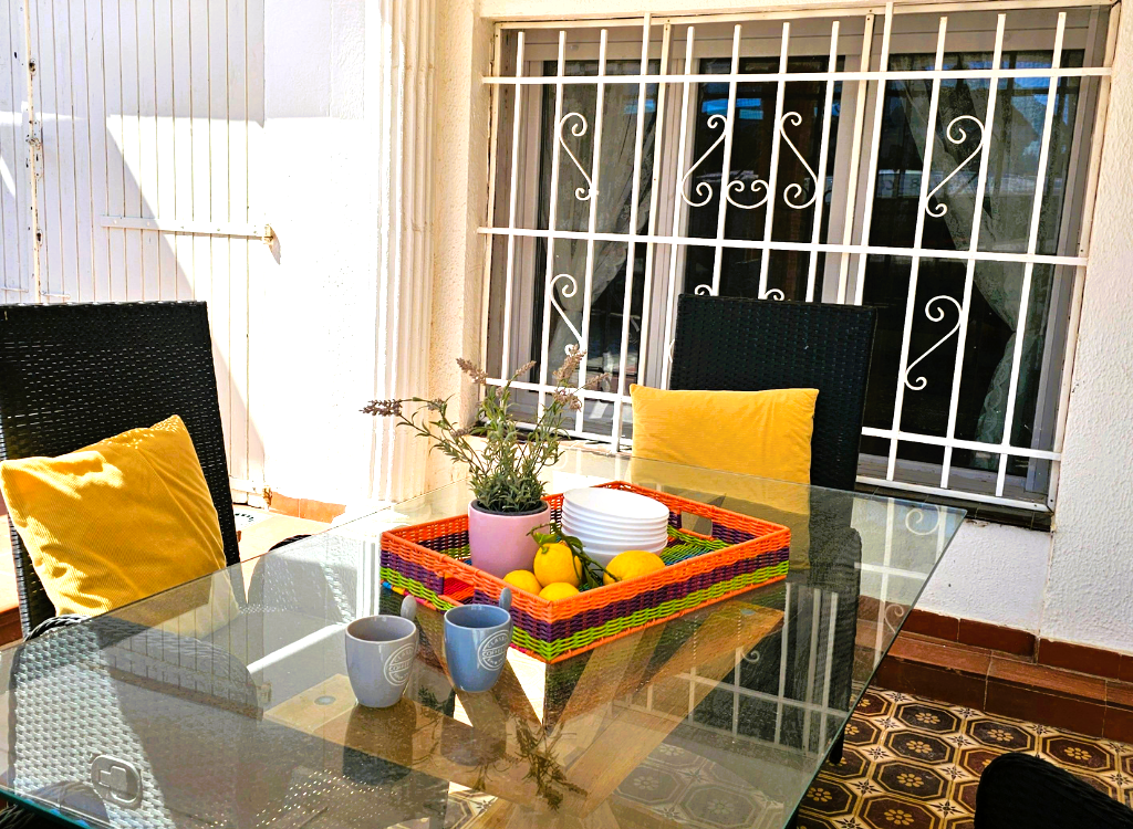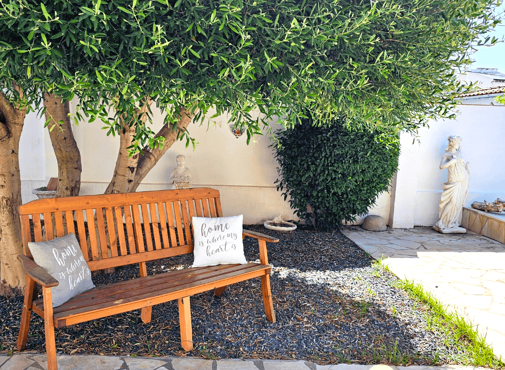 - Beide Häuser haben jeweils eine überdachte Terrasse mit Terrassentisch und Stühlen.