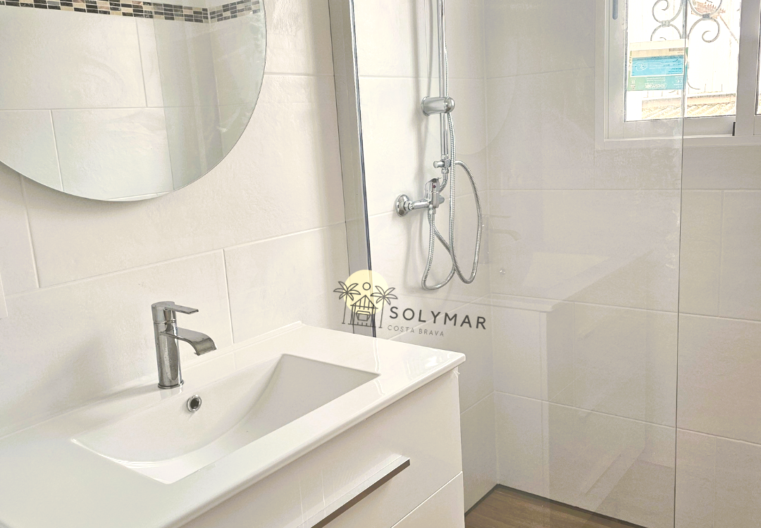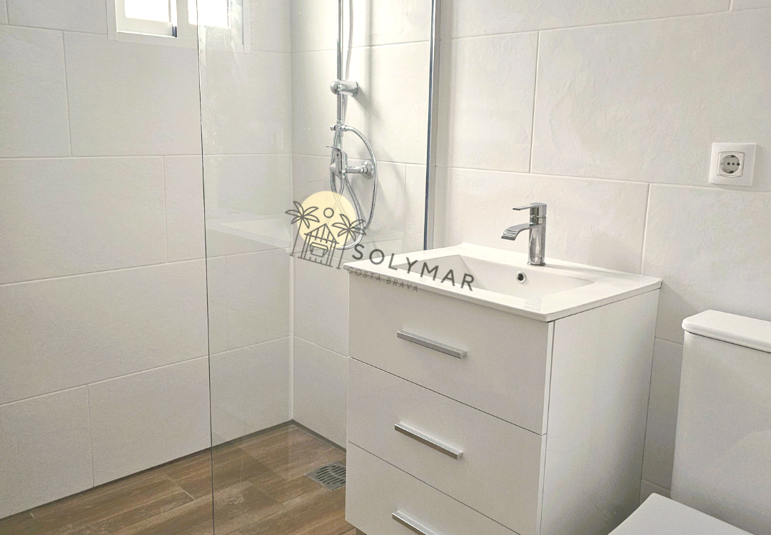 - Ein Badezimmer mit barrierefreier XXL - Dusche, Waschbecken und seperates WC.