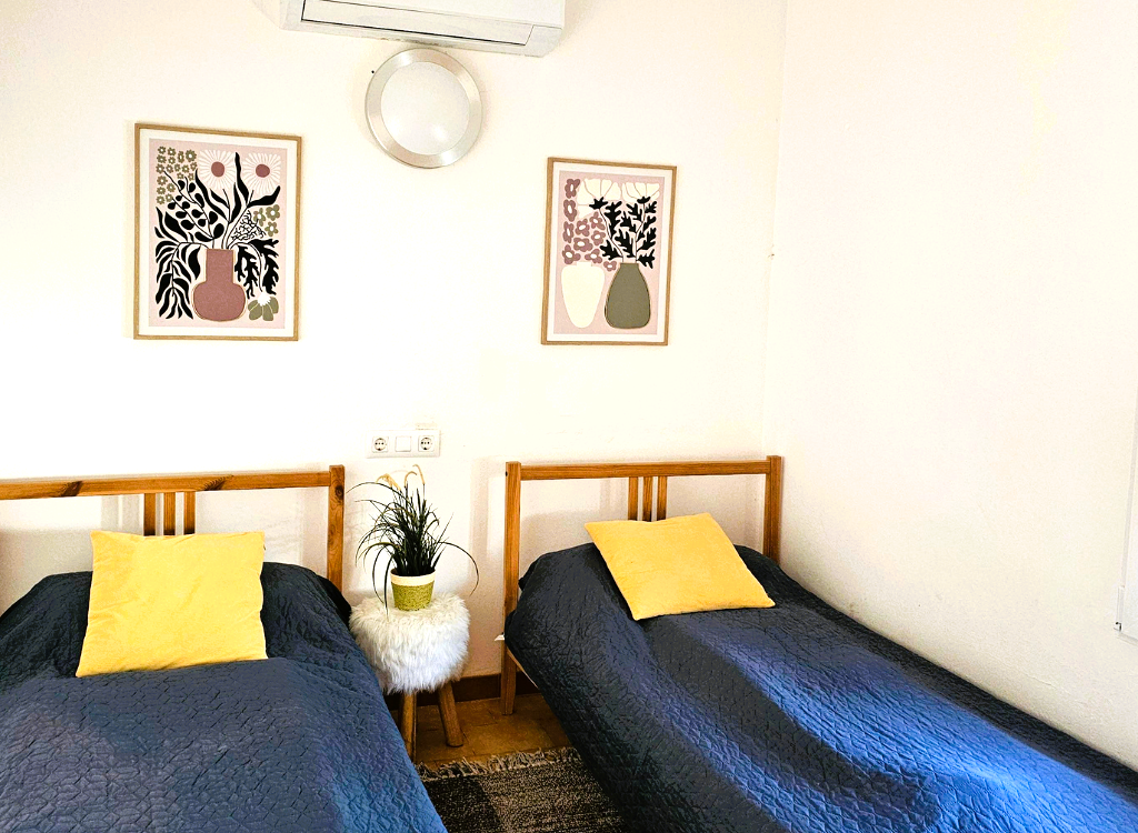 - Ein Schlafzimmer mit 2 Einzelbetten (90cm/200cm), Fenster mit Fliegengitter und Klimaanlage.