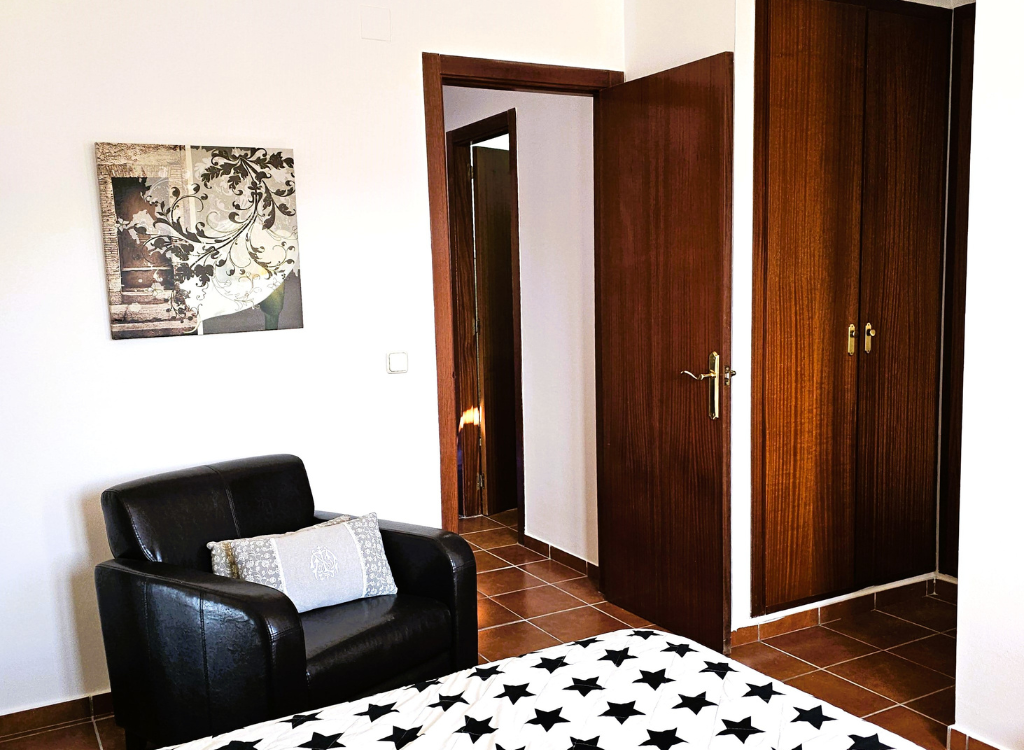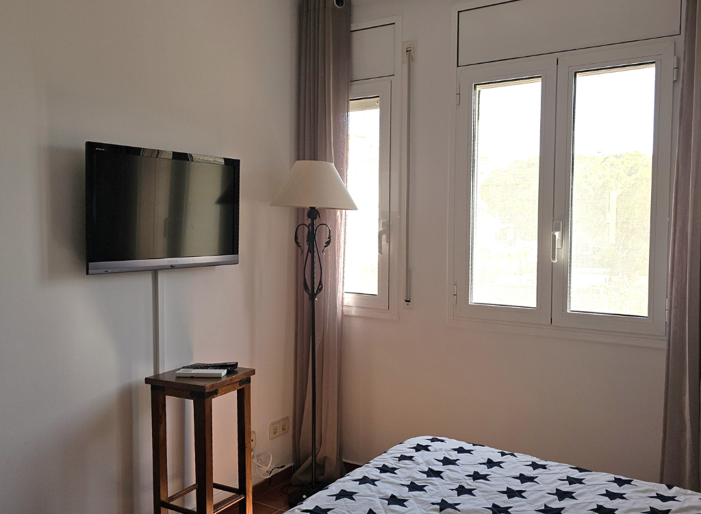 Ein sehr großzügiges Schlafzimmer mit Doppelbett (180 x 200 cm), TV, Klimaanlage und direktem Zugang zum Balkon mit Tisch, Stühlen und Markise. Hier können Sie den Tag ganz entspannt beginnen oder am Abend die ruhige Atmosphäre genießen.