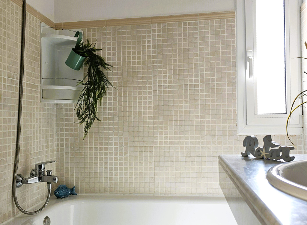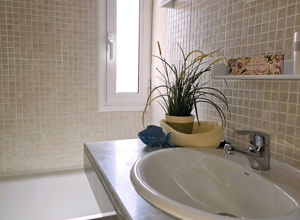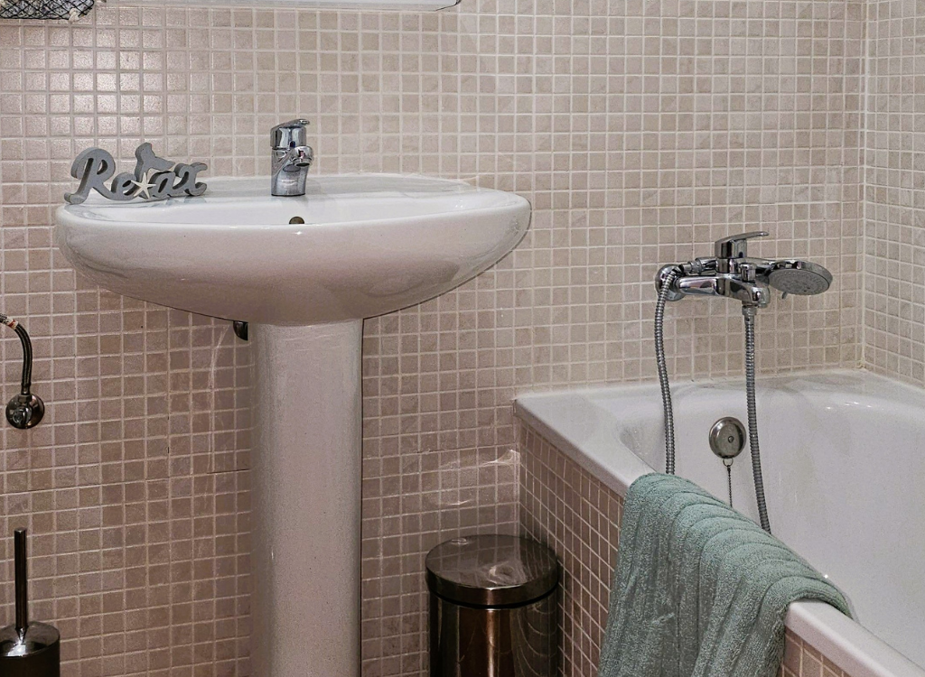 Ein zusätzliches Badezimmer mit Duschwanne, Waschbecken, WC und Bidet.
