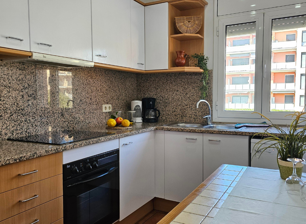 Geräumige, komplett ausgestattete Küche mit Kühl-Gefrierkombination, Backofen, Spülmaschine, Mikrowelle sowie sämtlichem Geschirr und Kochutensilien.