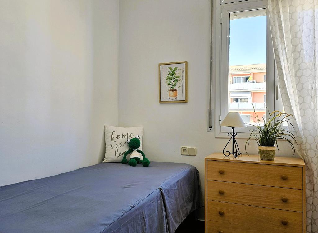 Ein weiteres Schlafzimmer mit einem Einzelbett (90 x 180 cm) und Rollo.
