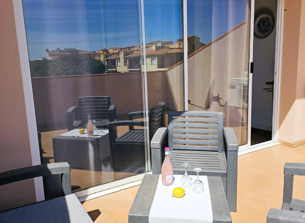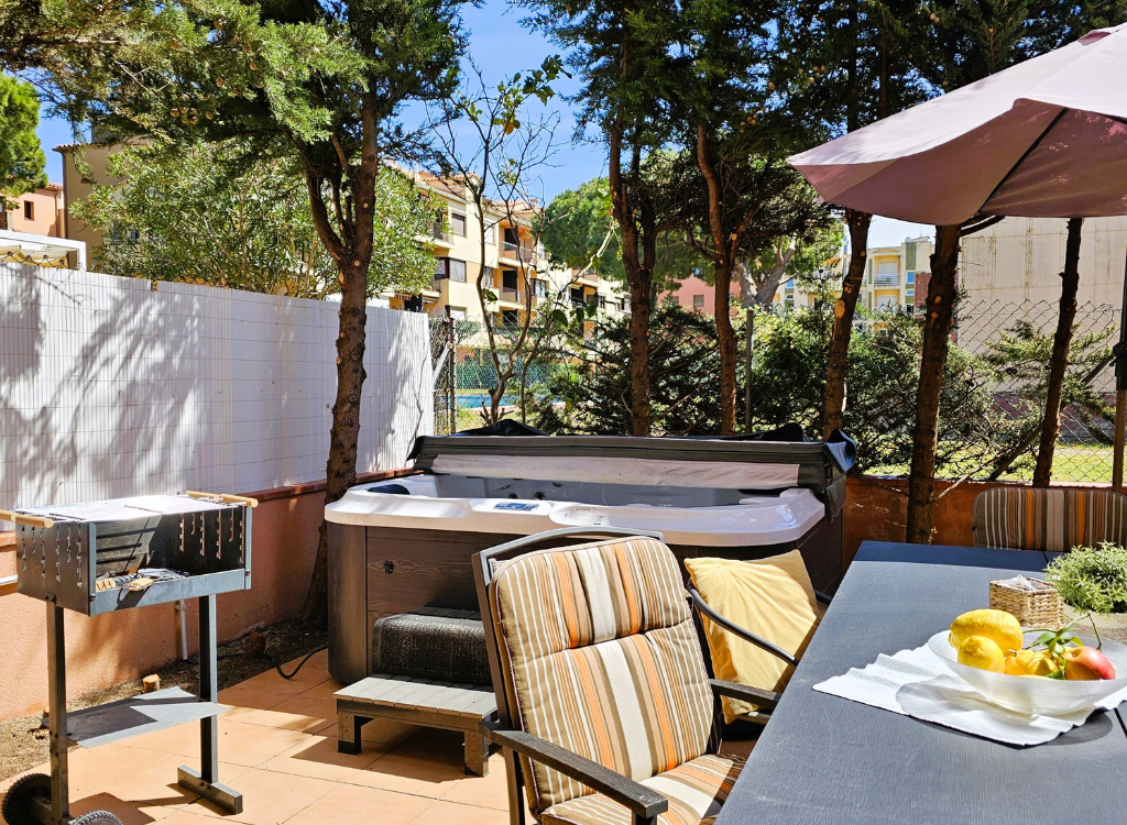 Die kleine, gemütliche Terrasse lädt mit Sitzmöglichkeiten, Whirlpool und Holzkohlegrill zum Verweilen ein. Ob ein entspanntes Frühstück, gesellige Grillabende oder erholsame Stunden im Whirlpool – hier lässt sich der Urlaub in vollen Zügen genießen.