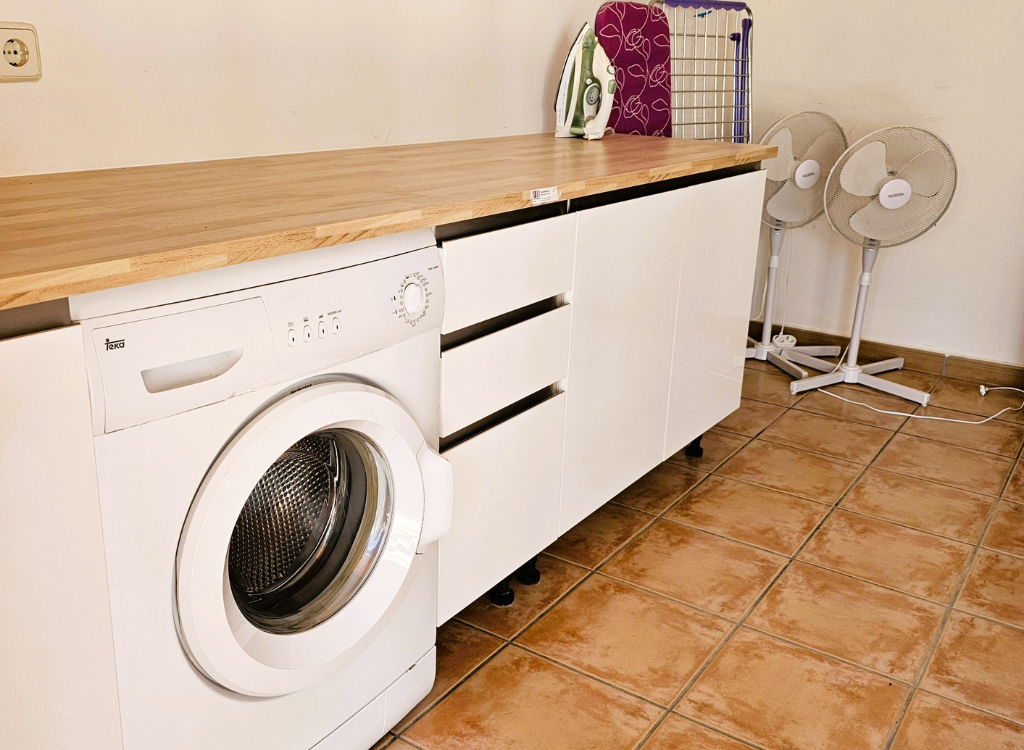 Waschraum mit Waschmaschine, Wäscheständer, Bügelbrett, Bügeleisen.