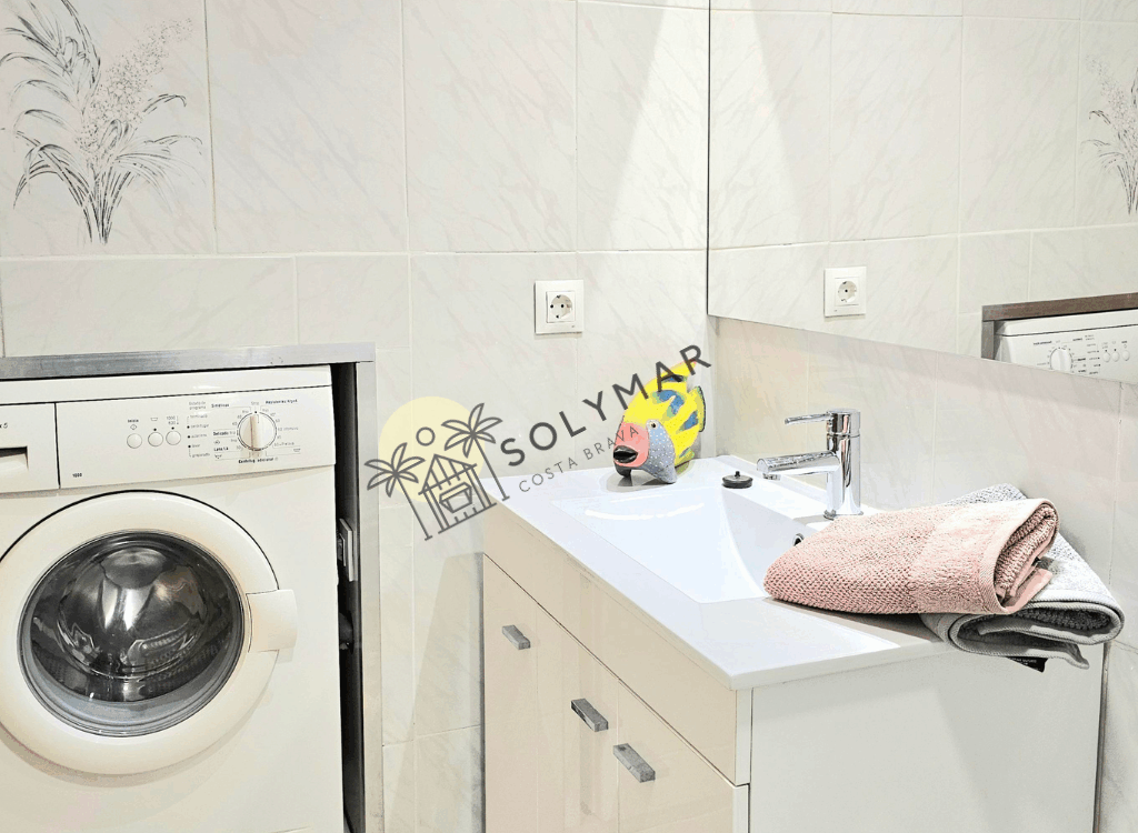 Im Badezimmer befinden sich eine große Dusche, ein Waschbecken, ein WC sowie eine Waschmaschine zur freien Nutzung.